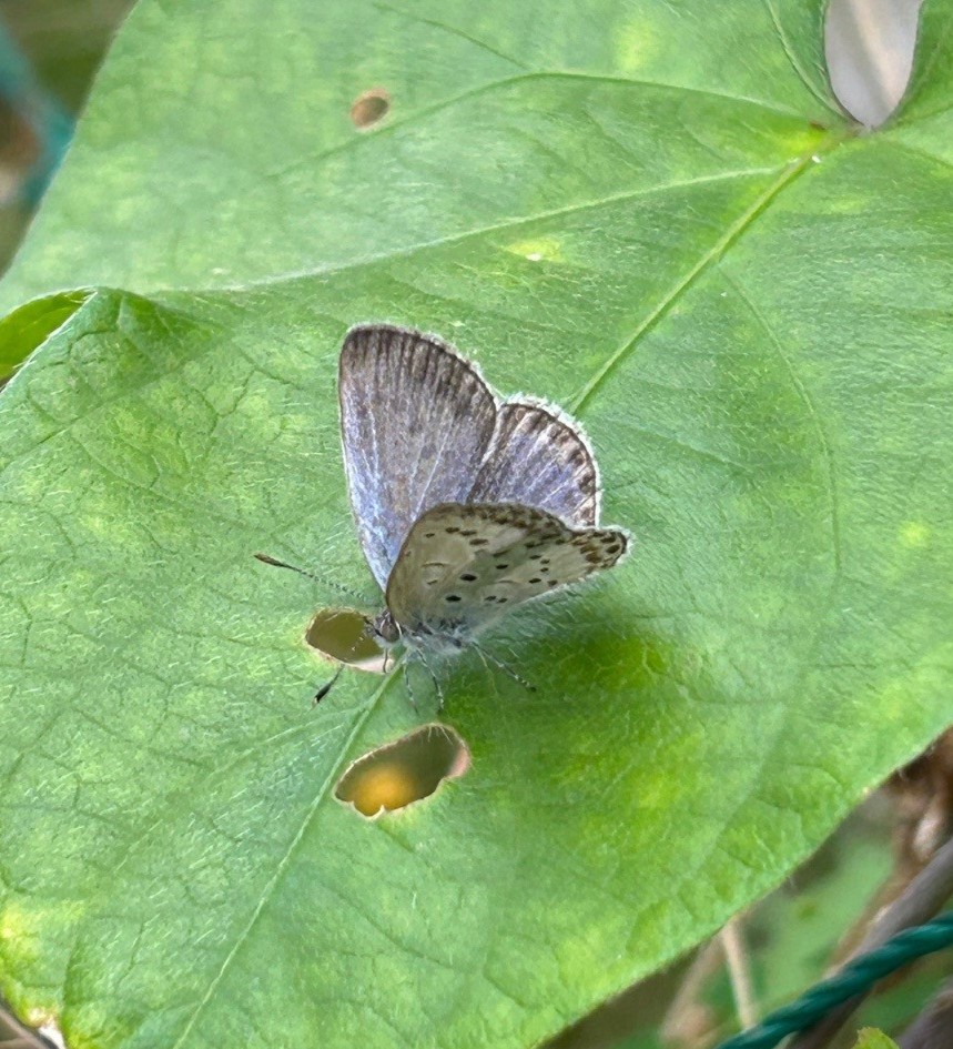 しばらく更新が滞っていました。酷暑だった夏を過ぎすっかり秋になり、エコガーデンの緑のカーテンのフウセンカズラに実ったフウセンは、茶色く実っています。葉が少なくなり、青々とした葉はリュウキュウアサガオ。その青い花や、こぼれ種から咲いたセイヨウアサガオ「ミルキーウェイ」の白い花がところどころに咲いています。ヤマトシジミの雄でしょうか、小さな蝶が翅を休めていました。