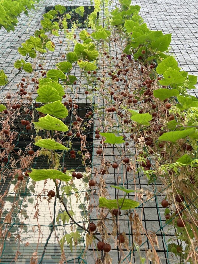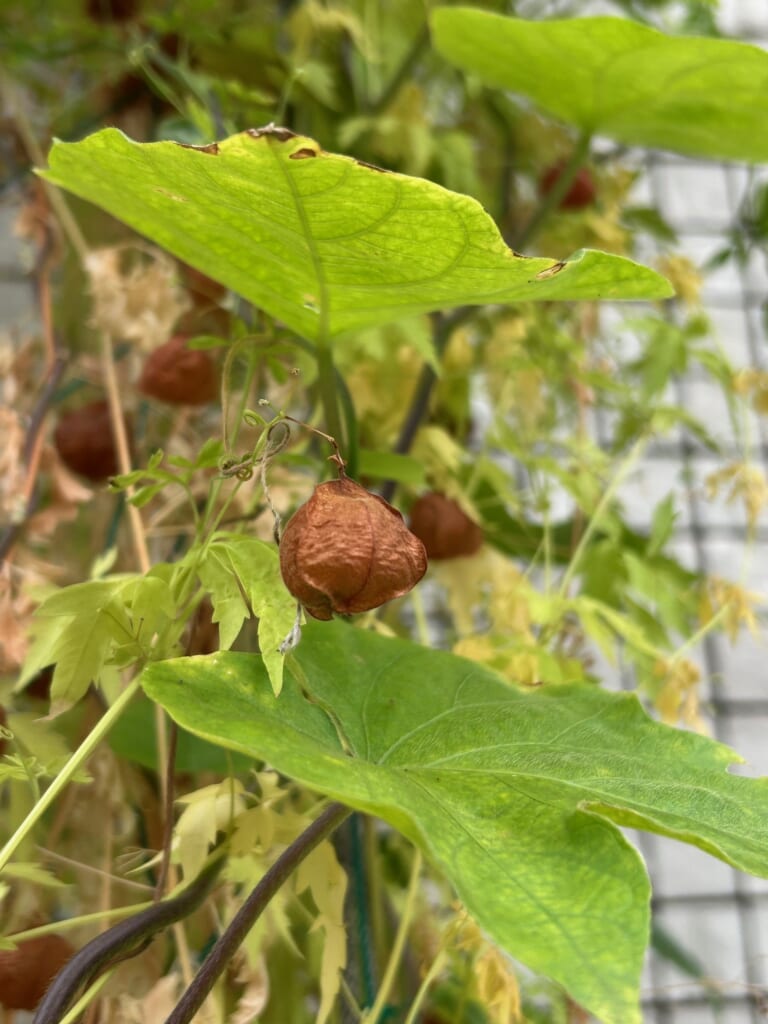 まだまだ暑い日が続きます。「フウセンカズラ」は熟した茶色のフウセンがたくさん実るようになりました。でも引き続きお花も咲いていて、虫もよく来ています。蟻が葉っぱにいるのを見かけました。今年は葉っぱの広がりが少ないようです。室内側から見たときに、少し寂しい気がしました。これから広がるといいのですが!