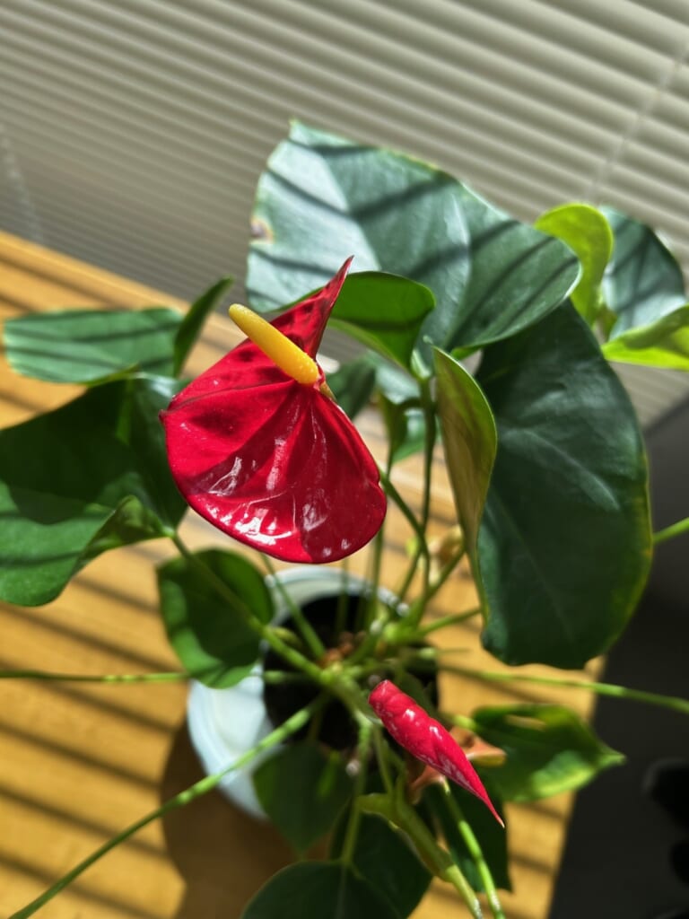 また、館内の鉢で育てている「アンスリウム」にも次々と花がついています。赤い部分は「仏炎苞(ぶつえんほう)」と呼ばれる部分で、花は中央のひも状の部分とのこと。面白い花ですね。