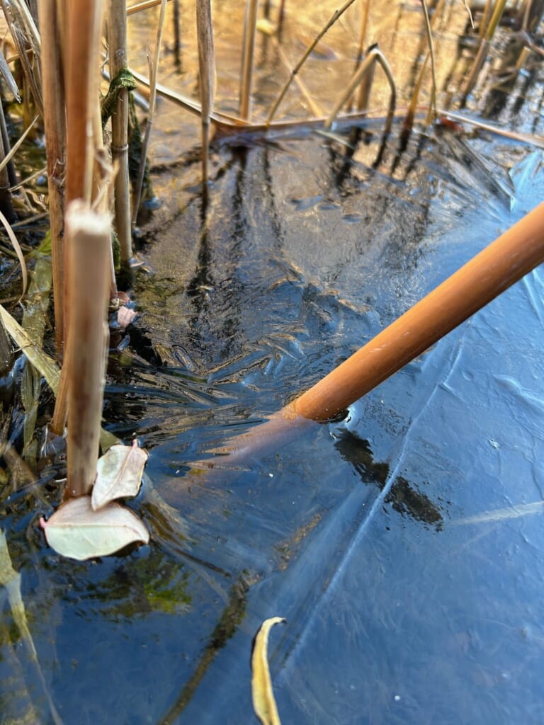今日(1月11日)は、1月とは思えない暖かさです。1月4日は薄氷でしたが、先日9日のビオトープは、かちこちに凍りました!今日の暖かさでまた融けてしまいましたが、水面に浮いた落ち葉や、水面から出たアシの茎の周りが凍り付いている様子がわかります。今晩からまた気温が急降下するとのこと。持続した春の暖かさは、まだ先のようです。