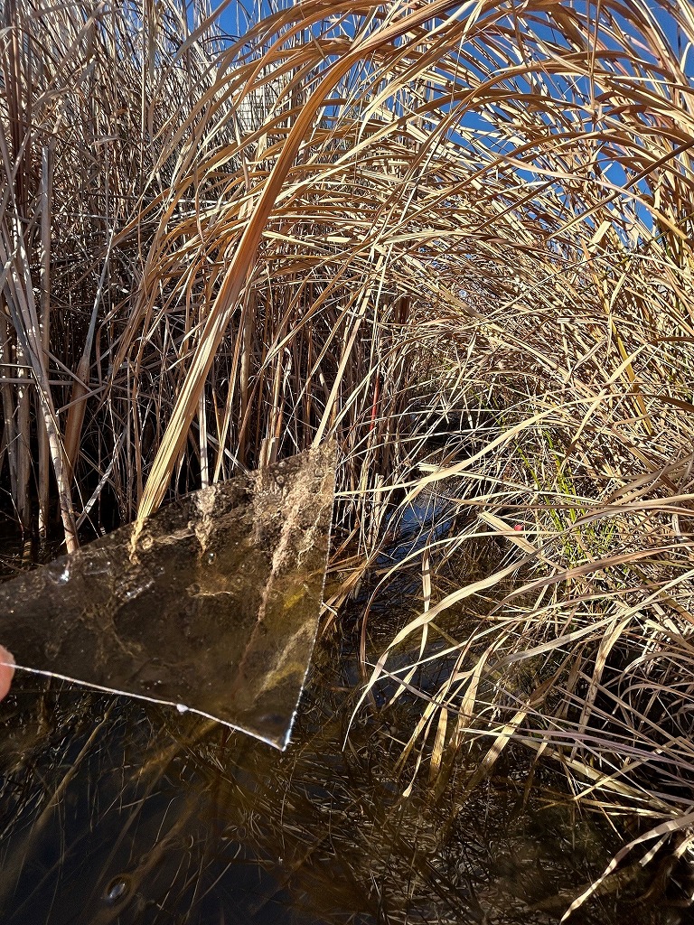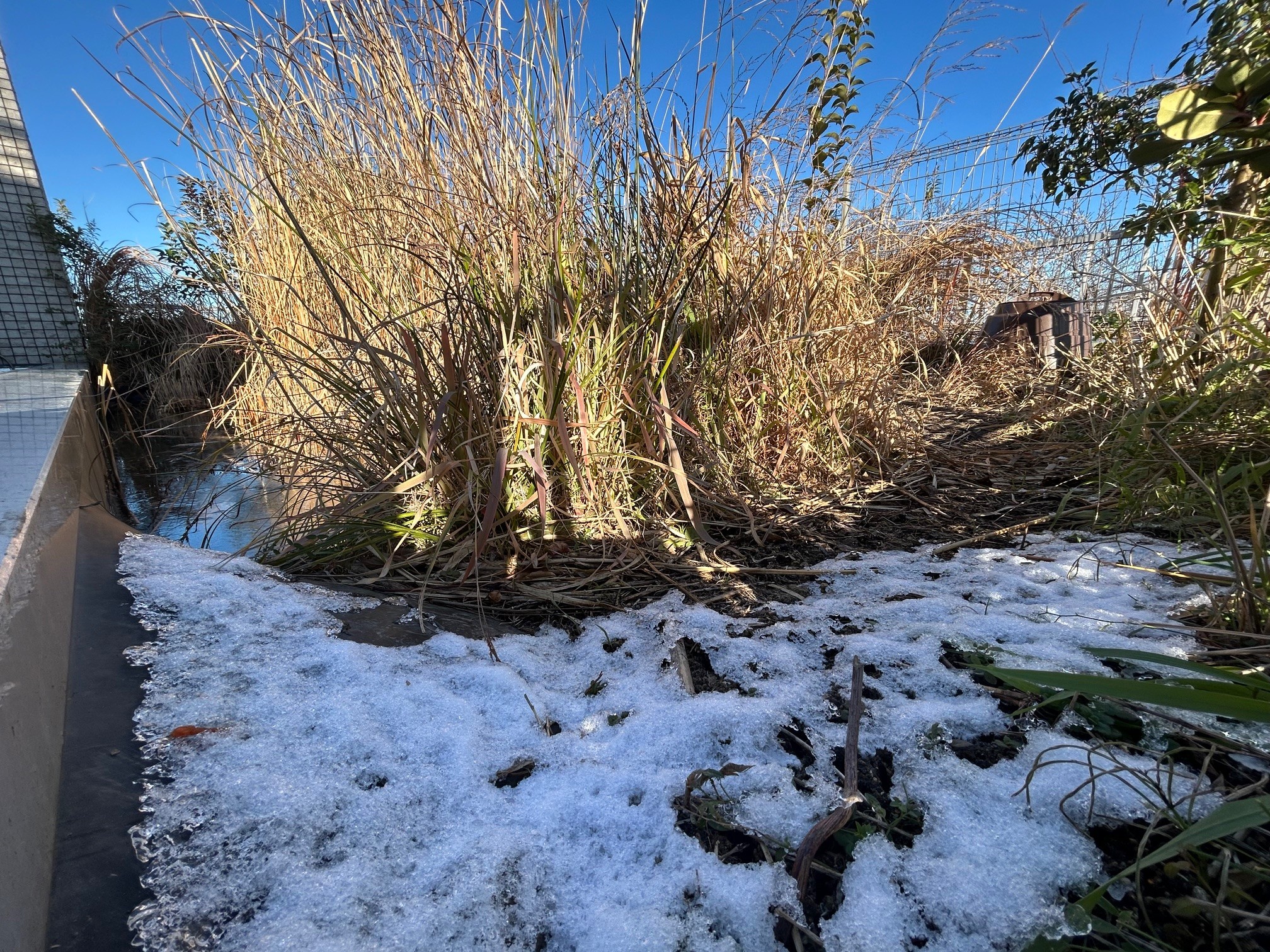 さて、1月2日の夜には東京は初雪が降りましたね!日陰には融けきらずに雪が残っているところも見られますが、ビオトープや畑にも雪が見られ、水にはうっすら氷も張っていました!寒さもひとしおです。生きものもなりを潜めているようで、見当たりません。