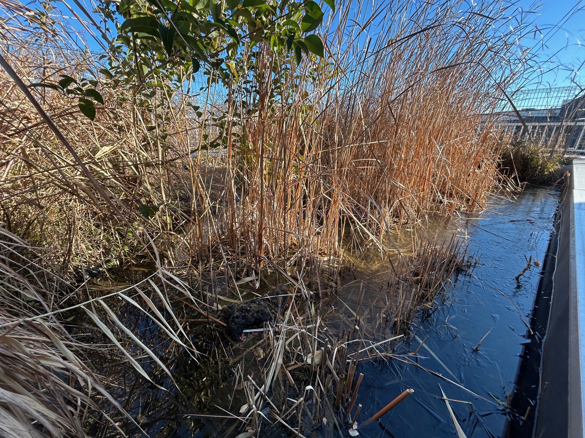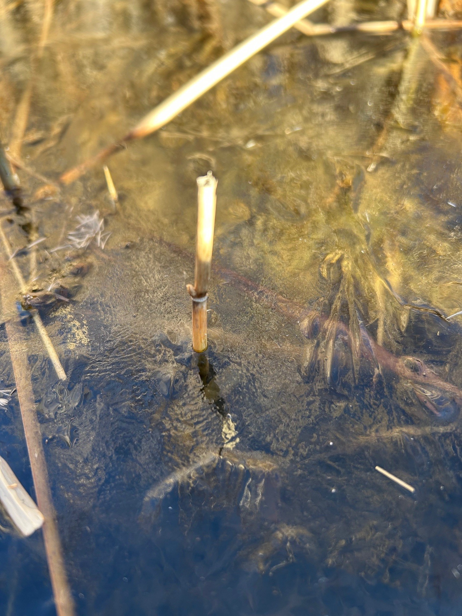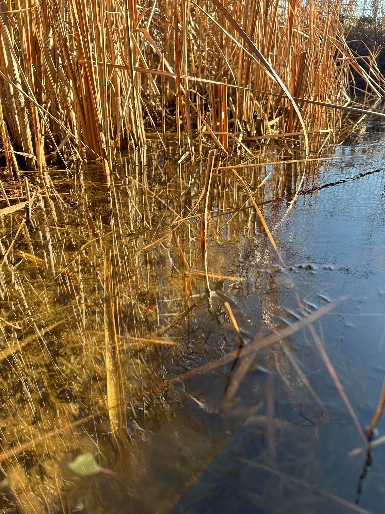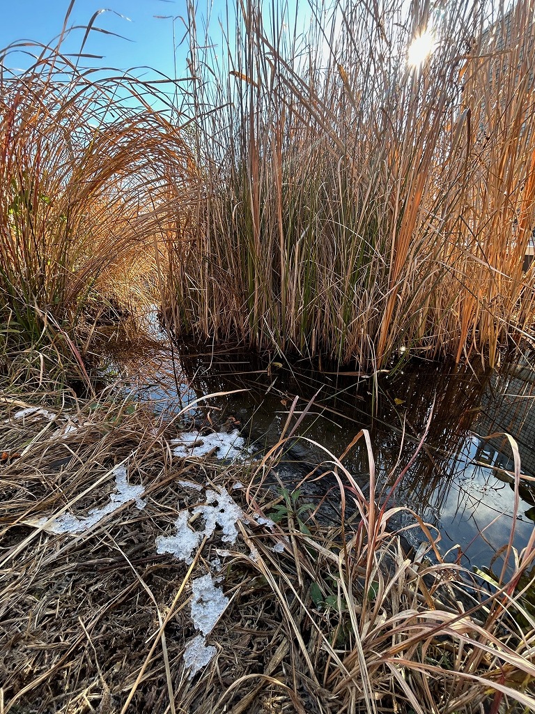 ビオトープはだんだん冬枯れの様相を呈してきました。水面をのぞき込んでも魚影は見えず、身を隠してじっとしているのでしょう。どこにいるのか分かりません。なかなか捕まえられません。