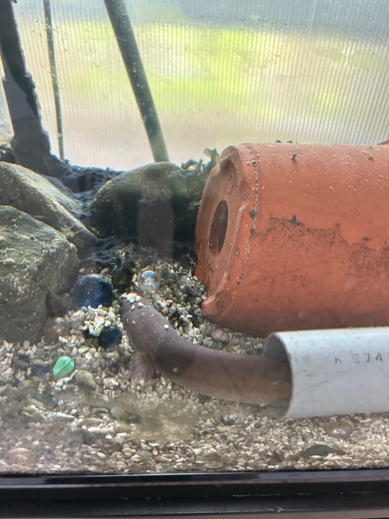 また、「ニホンウナギ」が砂に頭をつっこんでいる、なかなか見られないシーンをご紹介します!開館前の、館内が薄暗い時間帯に連日見られました。夜行性なので明るくなってきてまぶしいのでしょうか?昼間は筒の中にいることが多いので、見かけたらレアですよ。