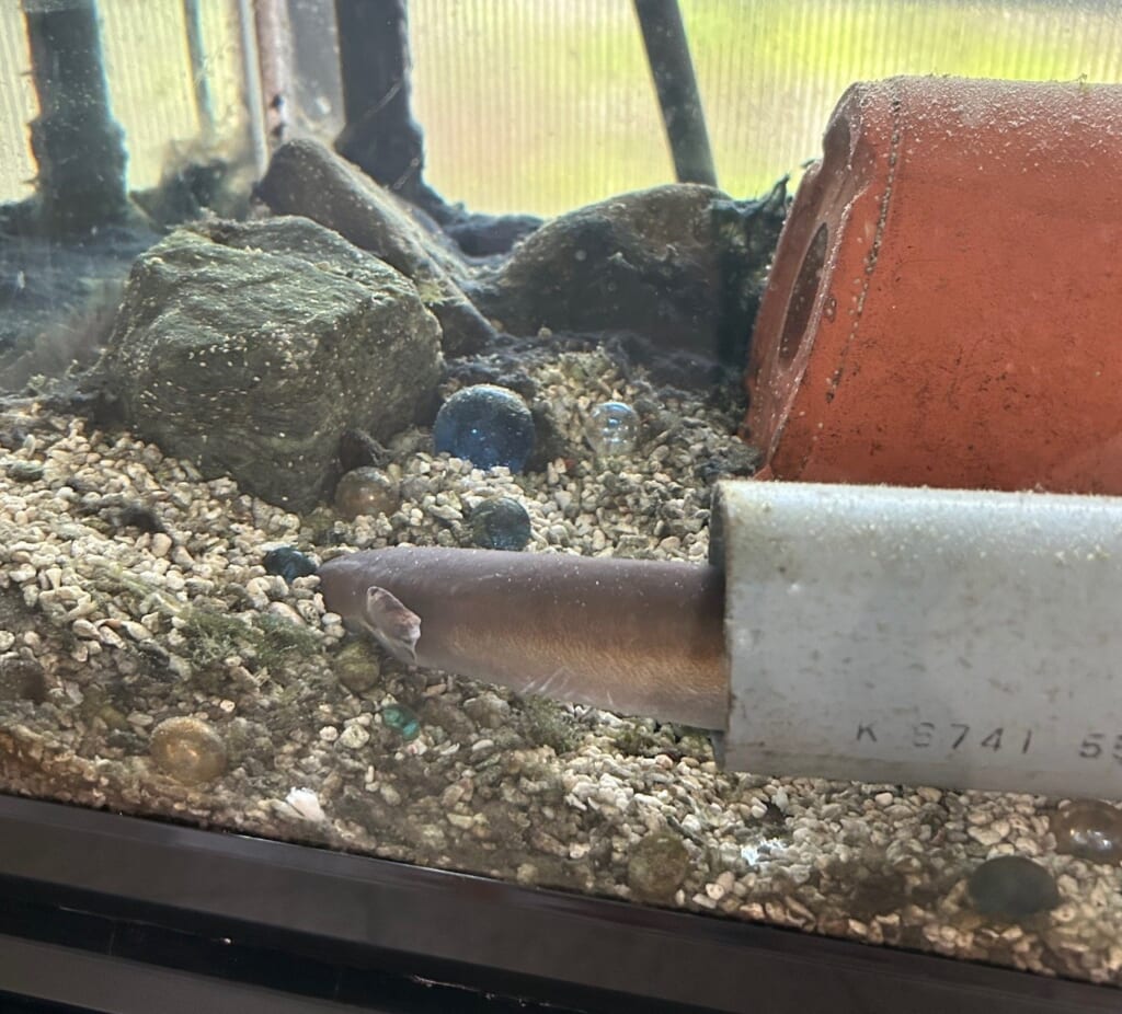 「ニホンウナギ」は2匹いますが、ケンカしてしまうので別々の水槽で飼育しています。普段は筒やホースの中に隠れていますが、閉館後に館内が暗くなるとたまに全身を出していることがあります。顔だけ砂につっこんでいることもありますよ。スタッフの餌やりの様子の動画も掲載しました!ぜひご覧ください。