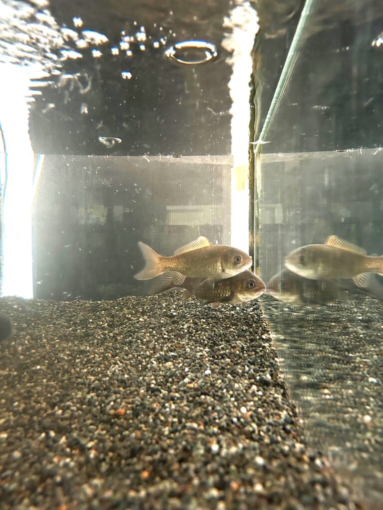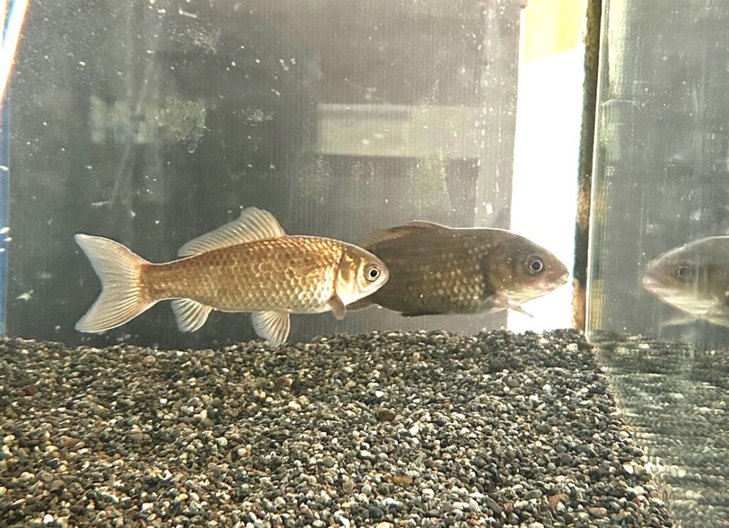 みなさん、「ギンブナ」を見たことがありますか?日本や中国大陸に棲む、金魚のご先祖さまともいえる魚です。当館には2匹いますよ。鱗の色がきれいですので、ぜひ見に来てください♪