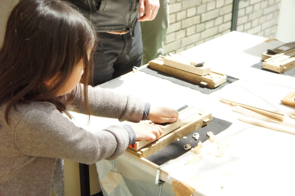 森について学んだ後、国産のヒノキを削って親子で箸を作ります。お米の袋の紙バンドを使って、素敵な箸置きも作ります。ヒノキのよい香りに包まれながら、楽しく工作しましょう♪(親子1組につき、箸は2膳作ります。)