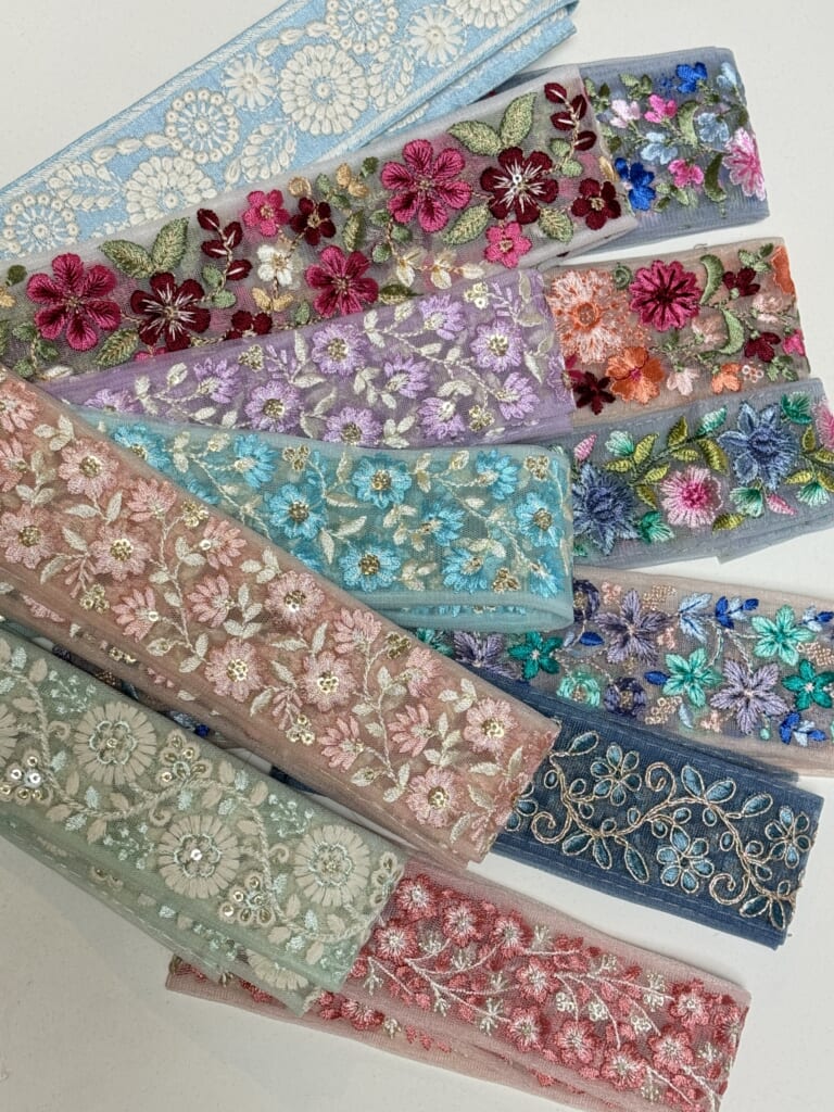 再生紙を原料とした環境にやさしい紙紐でバッグをつくります。クラフト紐は黒、グレーのどちらかお好きな色を選んでいただけます♪インド刺繍のリボンは見本の物以外にも種類があり、当日お選びいただけます。