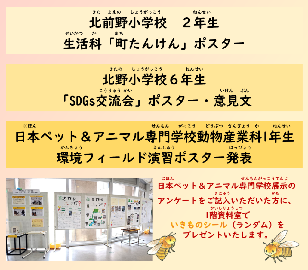 板橋区内の学校3校(板橋区立北前野小学校2年生・板橋区立北野小学校6年生・日本ペット&アニマル専門学校動物産業科1年生)の学習内容・活動の展示を始めました!